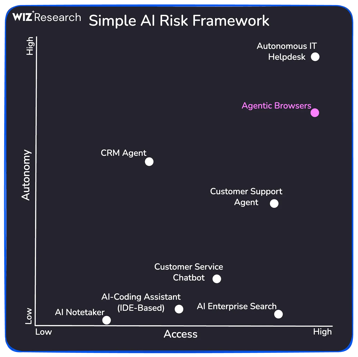 Browser agents occupy the most dangerous quadrant. They have high autonomy - they make decisions and take actions independently. They have high access - your logged-in sessions, your email, your files, potentially your banking.