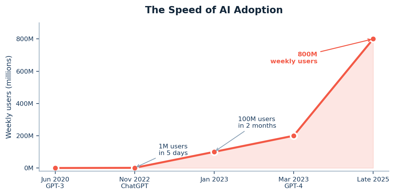 If you look at the usage curve for ChatGPT alone, it launched on 30 November 2022, hit one million users in five days, and reached 100 million within two months, making it the fastest-growing consumer application in history.